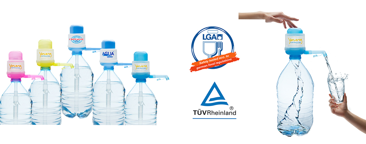 Pour bouteilles PET de 3-10 litres Idéale au camping, à la maison et au bureau, ainsi que pour le sport et les loisirs. La pompe à eau AguaQuick est le distributeur idéal pour toutes sortes de boissons : eau, jus de fruits, thé glacé etc.. La pompe se monte en un tour de main sur votre bouteille PET – son fonctionnement est si simple qu’il se passe d’explications. La pompe à eau AguaQuick est bien sûr appropriée aux denrées alimentaires, elle est facile à nettoyer et garantie lave-vaisselle (ne mettez pas le gonfleur au lave-vaisselle). Elle est solide, de poids faible et utilisable partout. Le rapport qualité-prix est non seulement sensationnel – associé à la longévité du produit, c’est le garant d’un article de qualité supérieure. Notre garantie est votre sécurité sécurité examinée selon législation des denrées alimentaires allemande Nos produits sont inspectés par le service de contrôle sanitaire de la Rhénanie d’après la législation allemande sur les denrées alimentaires. Il a été confirmé que nos produits ne présentent aucun risque pour la santé et le certificat « sécurité contrôlée d’après la législation sur les denrées alimentaires» a été délivré. Le service de contrôle sanitaire de la Rhénanie témoigne d’après la loi d’alimentation LFGB que nos produits sont sans danger pour la santé. Nos pompes ont été expérimentées tous et trouvées pour bon. Précaution avec des imitations en provenance de Chine ou de Bulgarie,Spain.